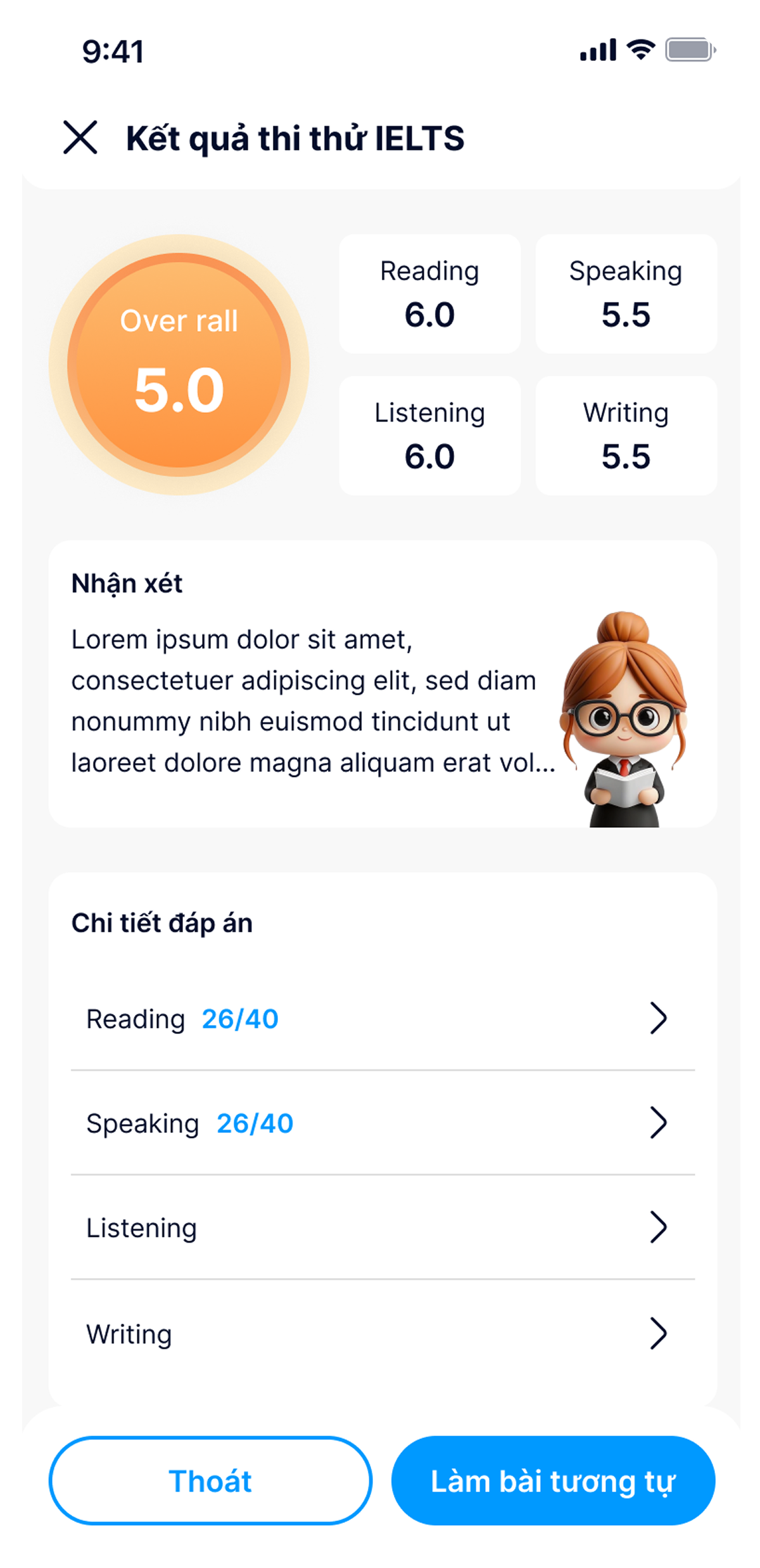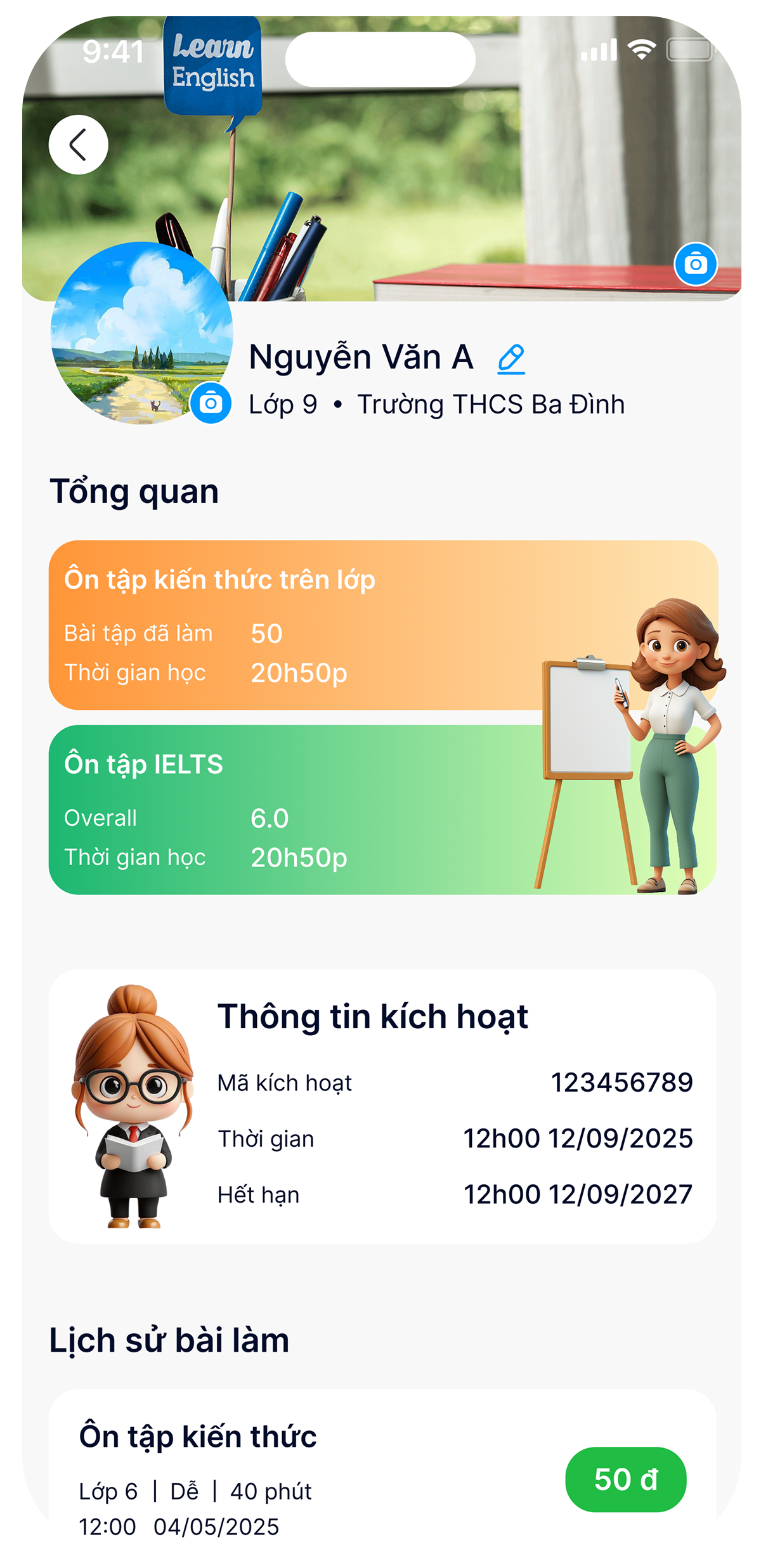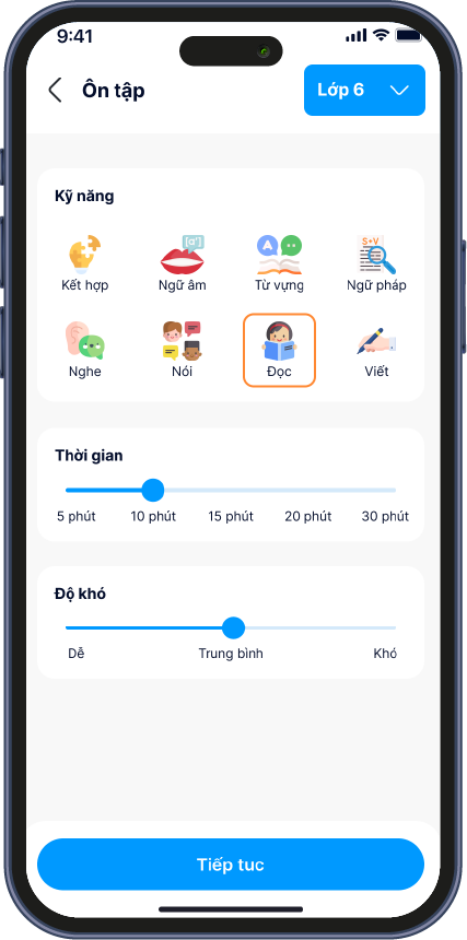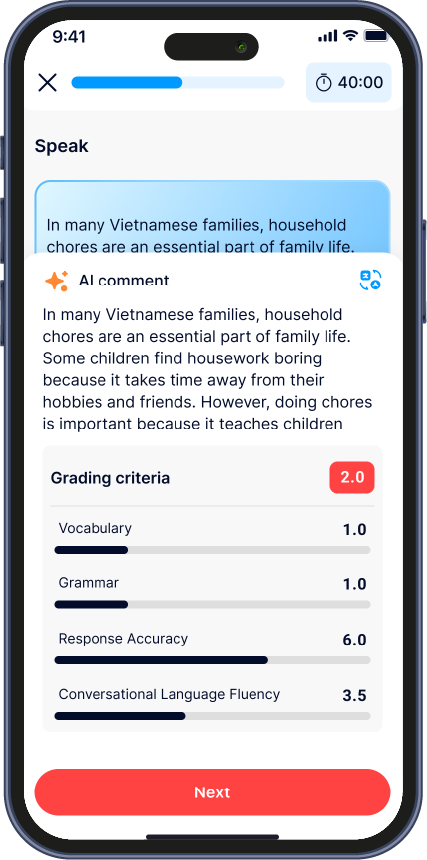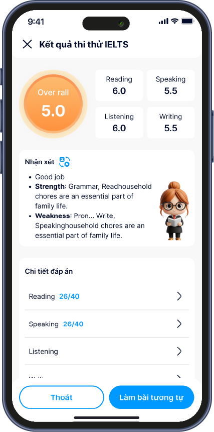 Ôn luyện và kiểm tra 4 kỹ năng tiếng Anh theo chương trình GDPT 2018. Làm quen định dạng các kỳ thi quan trọng: vào 10, THPT, IELTS, TOEFL, PTE…Nhận phản hồi tức thì từ AI, thấy rõ tiến bộ mỗi ngày.