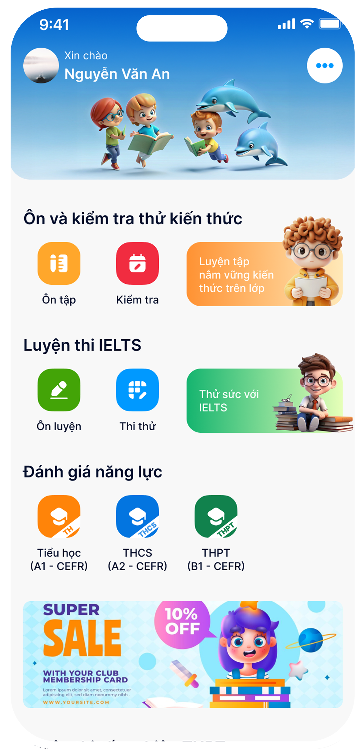 Giúp học sinh từ tiểu học đến THPT rèn luyện và đánh giá năng lực tiếng Anh theo chương trình GDPT 2018, đồng thời sẵn sàng cho các kỳ thi quan trọng: vào 10, THPT Quốc gia, IELTS, TOEFL, PTE…
